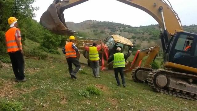 حاول رجال إنقاذ إعادة جرافة إلى وضعها الطبيعي بعد أن انقلبت على أحد جانبيها، لكن باءت هذه المحاولة بالفشل. لم يكتف العمال بالفشل في إعادة وضع الجرافة إلى ما كان عليه، بل "نجحوا" في زيادة الأمر تعقيدا، وذلك بسبب عدم توخيهم الدقة والحذر في عملهم، مما أسفر ذلك عن سقوط الجرافة في وادٍ كانت على حافته.