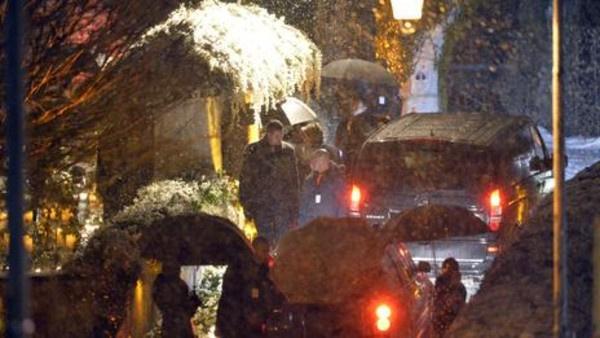 وقد احتمى غالبية المدعوين الذين ارتدوا لباس السهرة من الثلوج تحت مظلات كبيرة.
