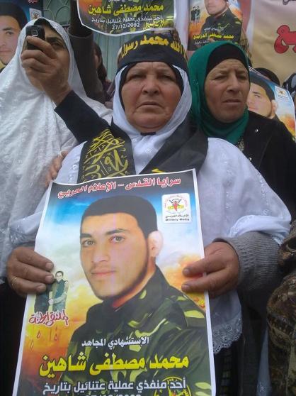 "هذا يوم زفاف ولدي بعد استلام جثمانه، فاليوم سنزفه في عرس كبير بحضور كل الأهل وسندفنه على الطريقة الإسلامية بجوار رفيقه أحمد الفقيه"، هذا ما قاله والد الشهيد محمد مصطفى شاهين، وأضاف:"لكن هناك علامات لبساطير جنود الاحتلال على تابوت ولدي، فأين الحرية والكرامة والعالم من هذه العنصرية التي تمارس حتى بحقّ الشهيد بعدما صار رفاتا".