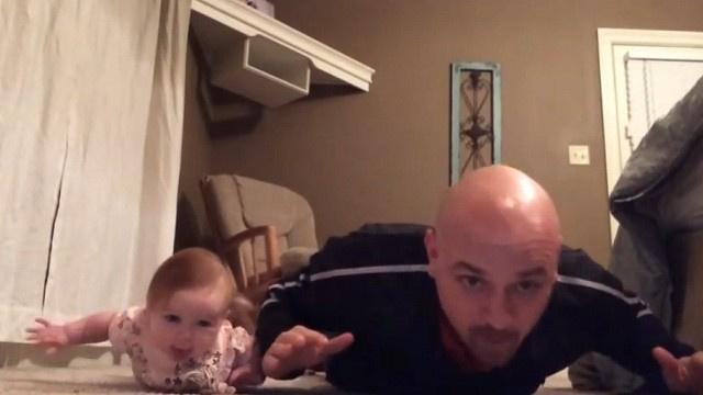 رفع ناشط تسجيل فيديو يظهر فيه مع طفلته الصغيرة وهما يمارسان تمرينا رياضيا بدا ممتعا بالنسبة للطفلة. فقد كان والدها في حالة استعداد للقيام بتمرين الضغط، وقد اتخذت طفلته الوضعية ذاتها.
