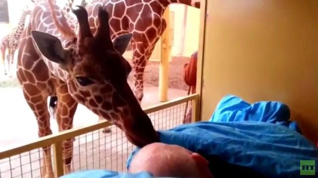 في مشهد لافت قامت زرافة في حديقة حيوانات هولندية بوداع عامل الحديقة الملقى على فراش الموت، لتقبله قبلة الوداع وكأنما شعرت أن حارسها ليس على ما يرام. وكان العامل الذي يعاني من سرطان مزمن قد طلب نقله الى الحديقة لتوديع الحيوانات التي أمضى معظم حياته في رعايتها.