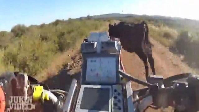 رفع نشطاء تسجيل فيديو رصدته كاميرا مثبتة في خوذة سائق دراجة رباعية، تظهر فيه بقرة على قارعة الطريق وتصطدم الدراجة بها.