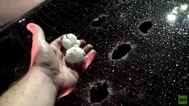 وصاحبت الَبَرد عاصفة قوية اجتاحت المنطقة، وبلغ قطر حبات البرد العملاقة نحو 5 سنتيمترات، وأدت الى تحطيم زجاج سيارات كثيرة في المنطقة.