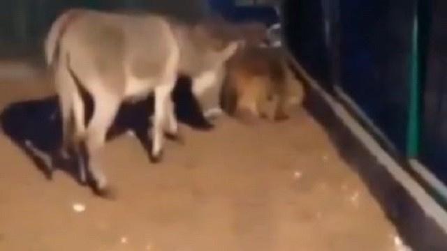 نشر نشطاء تسجيل فيديو التقط لحمار وأسد في قفص واحد، يظهر فيه "ملك الغابة" وقد اتخذ من إحدى الزوايا ملاذا، فيما كان الحمار يقف أمامه بشجاعة، ثم يركله وجها لوجه، وكررها بإحدى حوافره.