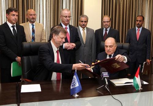 ووقع الاتفاقية: وزير الحكم المحلي، رئيس مجلس إدارة صندوق تطوير وإقراض البلديات سائد الكوني، ووزير المالية شكري بشارة، مع مدير البنك الدولي في فلسطين ستيف يورنسن، بحضور مدير عام صندوق تطوير وإقراض البلديات عبد المغني نوفل.