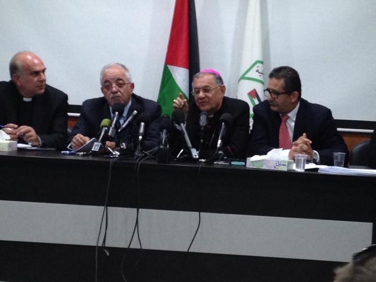 عقد مؤتمر صحفي حول زيارة البابا فرنسيس في مقر منظمة التحرير الفلسطينية في رام الله ،أمس الاحد،بحضورالبطريرك اللاتيني فؤاد الطوال وعضو اللجنة التنفيذية حنا عميرة ة السفير الفلسطيني لدى الكرسي الرسولي عيسى قسيسية والمستشار الرئيس للشؤون العلاقات المسيحية زياد البندك والناطق الاعلامي االرسمي للزيارة البابا الاب جمال خضر.