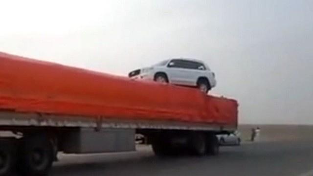 بالفيديو.. سيارة تطير لتستقر على متن شاحنة كبيرة