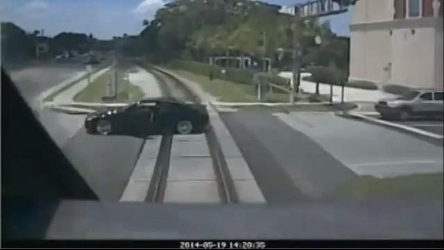 نشر نشطاء شريط فيديو مثيرا يظهر امرأة علقت سيارتها على سكة حديد لقطار في مدينة فلوريدا الأمريكية، وقد تمكنت من الخروج من السيارة قبيل ثوان من اصطدام القطار بسيارتها.