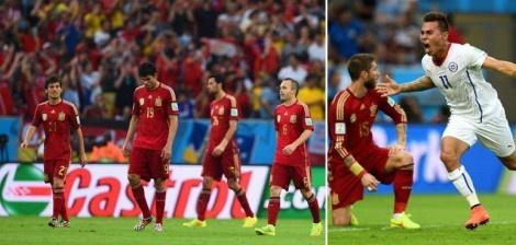 منذ قليل مباراة اسبانيا وتشيلي ضمن المجموعة الثانية من نهائيات كأس العالم والتي تجري على أرضية ملعب الماركانا الشهير في الريو دي جانيرو والنتيجة تشير إلى تقدم مفاجئ لتشيلي بهدفين مقابل لاشيء لتخرج اسبانيا من الدور الأول وتتأهل تشيلي إلى دور الستة عشر في أكبر مفاجآت دور المجموعات .