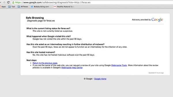 بعد زيارة الرابط تظهر معلومات من جوجل عن الموقع المطلوب، باعتبار أن محرك بحث جوجل يزور ملايين المواقع يومياً وبشكل آلي. حيث يتم في هذه الصفحة حالة الموقع فيما إذا كان يحتوي على برمجيات خبيثة أو مُصنف على أنه موقع خبيث.