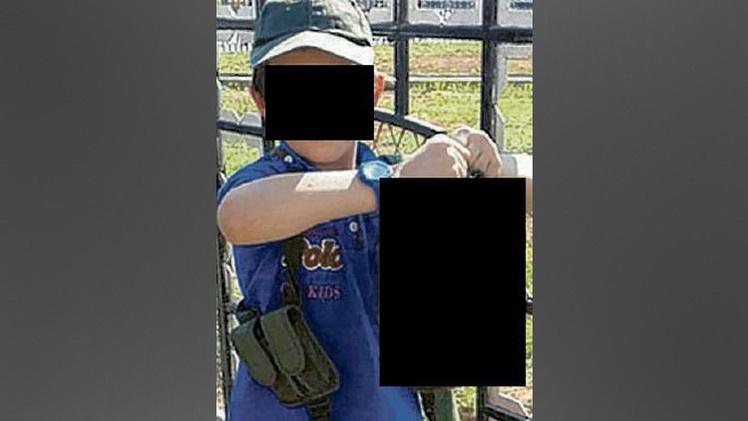التقط أب صورة لابنه البالغ من العمر 7 سنوات، وهو يحمل في يده رأسا مقطوعة لجندي سوري، وعبر الأب عن سعادته وفخره بابنه، بمشاركته الصورة على مواقع التواصل الاجتماعي.