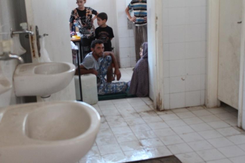 عائلة "عمارة" لجأت إلى مدرسة مملكة البحرين غرب مدينة غزة التابعة لوكالة غوث وتشغيل اللاجئين الفلسطينيين "أونروا" التي تضم أكثر من ثلاثة ألاف نازح، لكن ضيق المكان أجبرها على الاستقرار في مرحاض، يصحوا الأب واطفاله في المرحاض.