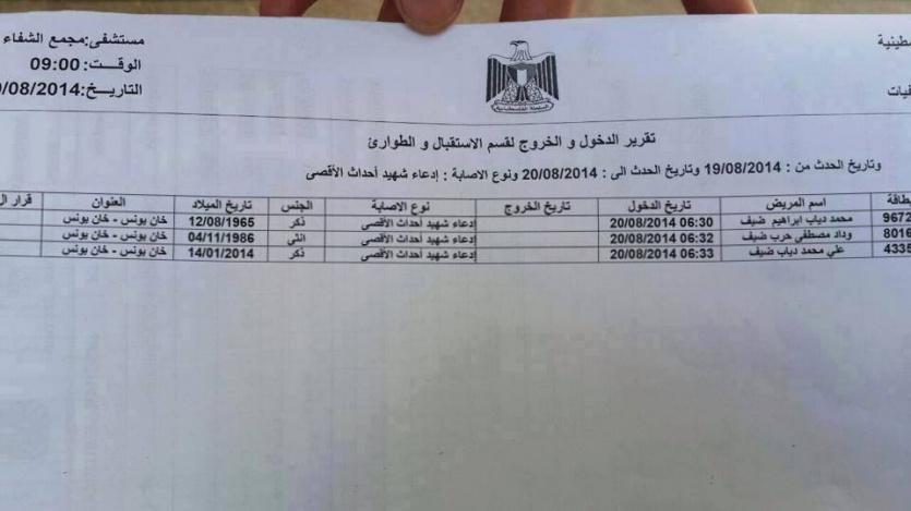 وحذرت الوازرة من التعامل مع هذه الوثيقة والتي جاء فيها دخول قسم استقبال مجمع الشفاء الطبي اسم محمد الضيف في قائمة مفبركة للشهداء.