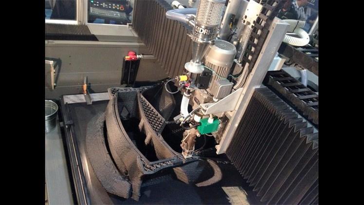 وتقوم الطابعة الضخمة بطبع طبقات من الصالون والشاسيه باستخدام المادة البلاستيكية السوداء المدعومة بألياف الكربون.