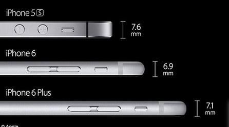 وأظهرت صورة خلف نائب رئيس التسويق في شركة آبل فيل شيللر توضح الفرق بين"آي فون 5 إس" الذي يبلغ سمكه 7.6 ميلليمتر، و"آي فون 6" الذي يأتي بسمك 6.9 ميلليمتر، بالإضافة لـ "آي فون 6 بلس" الذي يبلغ سمكه 7.1 ميلليمتر.
