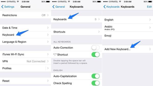 ويمكن بعد تثبيت لوحة مفاتيح جديدة من متجر آبل للتطبيقات، إضافتها عن طريق الذهاب إلى Settings، ومن ثم General، وبعد ذلك خيار Keyboard، ومنه الخيار الأول Keyboards، وبعد ذلك Add New Keyboard.