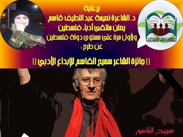 اعلن الشاعر حسام غنام مدير ملتقى أدباء فلسطين ولأول مرة على مستوى فلسطين عن طرح (جائزة الشاعر سميح القاسم للإبداع الأدبي بنسختها الاولى لهذا العام 2014) التي ستكون سنوية.