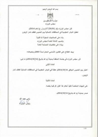 أعلنت الحكومة عن تعطيل الوزارات والمؤسسات الحكومية في المحافظات الشمالية يوم الخميس 16/10/2014 لقطف ثمار الزيتون.
