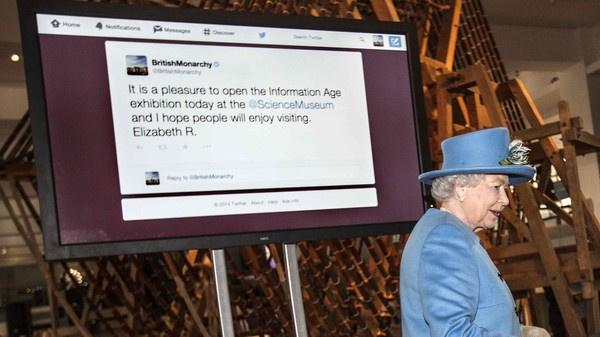 وقالت الملكة البريطانية (88 عاما) في تغريدتها في افتتاح صالة عرض جديدة في متحف العلوم في لندن "من دواعي سروري أن افتتح صالة عرض عصر المعلومات اليوم في متحف العلوم وآمل أن يستمتع الناس بزيارتها. إليزابيث أر".