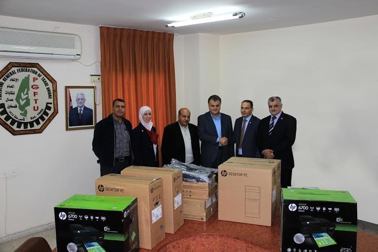 بنك القدس يتبرع بأجهزة ومعدات مكتبية للاتحاد العام لنقابات عمال فلسطين