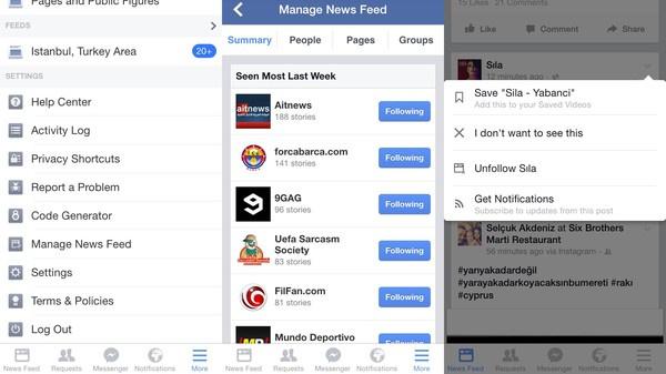 ويُمكن لمستخدمي تطبيق الموقع على الأجهزة الذكية الضغط على التبويب الأخير المزيد More ومن ثم الضغط على إدارة آخر الأخبار Manage News Feed، لتظهر بعدها آخر الصفحات التي قامت بنشر مشاركات كذلك الأمر بالنسبة للأصدقاء، ليقوم المستخدم بإلغاء متابعة المُزعج منها أو متابعة ماقام بإلغاء متابعته سابقاً.