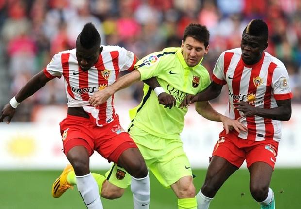 فاز برشلونة بصعوبة شديدة في الجولة الحادية عشر من مباريات الدوري الإسباني على ألميريا على استاد "ألعاب البحر المتوسط -إل ميديتريانو- بهدفين لهدف رغم تأخرهم حتى الدقيقة 72 في اللقاء بفضل هدف المهاجم الكونغولي "ثييفي" المُبكر، لكن برشلونة عاد في الدقيقتين 72 و82 عبر هدفي نيمار وخوردي ألبا من صناعة لويس سواريز وبذلك يرفع البارسا رصيده للنقطة رقم 25 في المركز الأول بشكلٍ مؤقت، ويبقى رصيد ألميريا بـ9 نقاط فقط في المركز الرابع عشر.