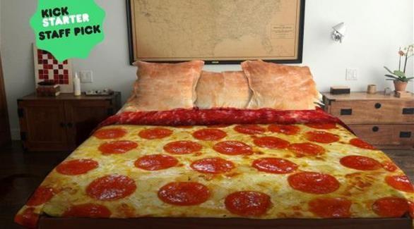 ويتألف سرير البيتزا من لحاف مصنوع من الجبن والبيبروني ووسادتين من العجين المقرمش، وشراشف من الصلصة، وكلّها قابلة للأكل أو حتى النوم في داخلها.