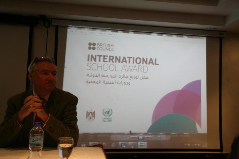وشكر السيد ألان سمارت ممثلي المؤسسات الشريكةعلى تعاونهم من أجل دعم وتطوير العملية التربوية في فلسطين. واستعرض محطات المشروع بدءاً من تدريب المعلمين والمعلمات والمديرين والمدراء، والزيارات المتبادلة بين المدارس الفلسطينية والبريطانية خلال العامين الماضيين. وقال: "إنه من الرائع الاحتفال بالمدارس الفائزة بجائزة المدرسة الدولية، وإنها طريقة رائعة للاعتراف بالجهود المبذولة والإنجاز الذي حققته المدارس الفلسطينية أسوة بنظيراتها حول العالم". وأبدى سعادته من تمكن المجلس الثقافي البريطاني من لعب دور محوري بالشراكة مع أصدقائه في وزارة التربية والتعليم ووكالة الغوث لمصلحة العملية التربوية في فلسطين.