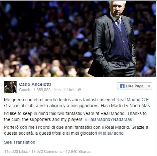 وبدوره، نشر أنشيلوتي رسالة بثلاث لغات -الإسبانية، الإنجليزية والإيطالية- على صفحته الرسمية بموقع التواصل الاجتماعي الشهير فيس بوك، مؤكداً فيها اعتزازه بالعامين الذين قضاهما على رأس الجهاز الفني بقلعة البرنابيو، واللتين شهدتا تحقيق الفريق لدوري أبطال أوروبا للمرة العاشرة بالإضافة لكأس إسبانيا في عامه الأول، إلا أنه قد دفع ثمن عدم تتويجه ببطولةٍ كبرى في العام الأخير، بالرغم من تتويجه بلقبي كأس السوبر الأوروبي وكأس العالم للأندية -الشرفيين- في وقتٍ مبكرٍ من الموسم الحالي.