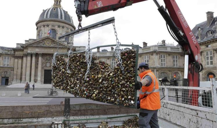 ما بين سبعمئة ألف ومليون قفل يصل وزنها إلى 45 طنا ناء بحملها جسر الفنون قبل أن يخلصه منها اليوم عمال بلدية باريس، الذين تجندوا بآلياتهم لحمل هذه الأقفال بعيدا، على الرغم من أنهم قطعوا معها بالمناشير جزءا من سياج الجسر الذي كانت تعلق عليه الأقفال.