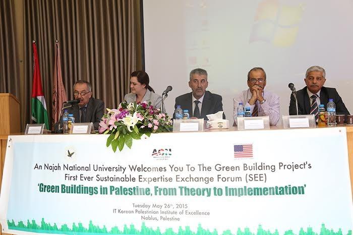 بمشاركة خبراء فلسطينيين ودوليين، نظمّت جامعة النجاح الوطنية ممثلة بالزاوية الأمريكية نابلس ومركز أبحاث البناء والمواصلات بالشراكة مع القنصلية الأمريكية العامة في القدس، يوم الثلاثاء الموافق 26/5/2015، المنتدى الأول من نوعه في فلسطين لتبادل الخبرات حول المباني الخضراء والمستدامة تحت عنوان "المباني الخضراء في فلسطين: من النظرية إلى التطبيق"، وذلك في قاعة مؤتمرات المعهد الكوري الفلسطيني المتميز لتكنولوجيا المعلومات في الحرم الجامعي الجديد، وتولى عرافة المنتدى الآنسة عليا جلبرت، منسقة الزاوية الأمريكية.