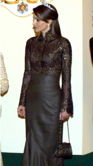 تنورة ماكسي بلون الشوكولا، بخصر عالٍ مع حزام عريض، وقصة حورية البحر، ظهرت بها للمرة الأولى عام 2001 في حفل رسمي حضرته خلال زيارتها للعاصمة البريطانية، يومها نسقت الملكة مع التنورة بلوزة بنية اللون مع تطريز ذهبي بأكمام طويلة وأزرار أمامية وياقة عالية، وحملت كلاتش كلاسيكية بلون مطابق، ورفعت نصف شعرها مزنية رأسها بتاج ماسي متناغم مع الأقراط الطويلة.