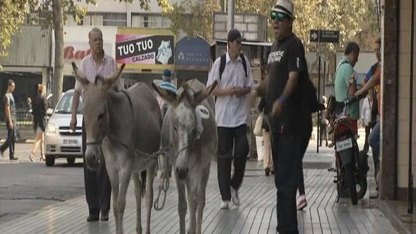 يقصد كل صباح ريكاردو الغرييا وسط العاصمة التشيلية سنتياغو لبيع الحليبِ بصحبة حماريه ماتيلدا وكارلوس.