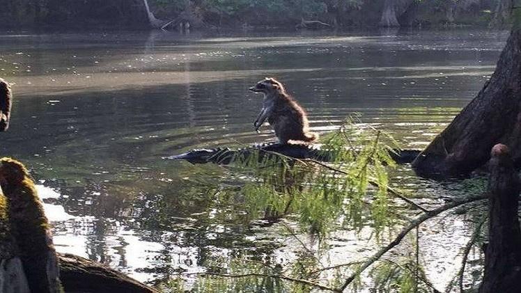 فقد رصد جونز الذي كان برفقة عائلته بالغابة، حيوان الراكون وهو يمتطي ظهر تمساح.