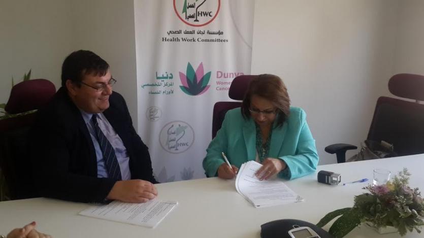 وقعت مؤسسة لجان العمل الصحي ممثلة بالمديرة العامة شذى عودة مع ممثل النمسا لدى فلسطين أندريا ناس إتفاقية تعاون في مشروع يخص مركز دنيا لتشخيص أورام النساء التابع للعمل الصحي.
