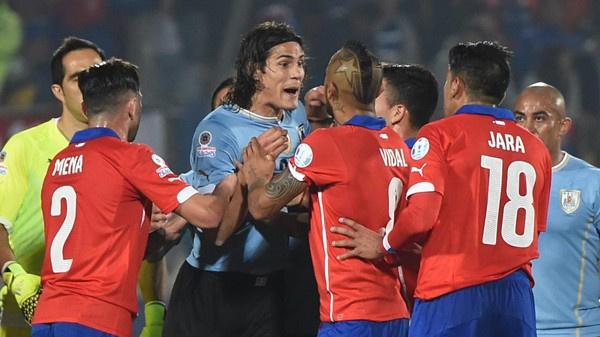 ورد كافاني بدفع خارا بيده لكن اللاعب التشيلي سقط أرضا وكأنه تلقى لكمة.