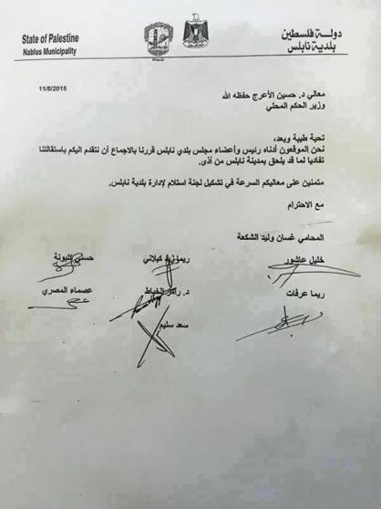 أعلن غسان الشكعة رئيس بلدية نابلس استقالته وسبعة من أعضاء المجلس البلدي هم خليل عاشور وريما كيلاني وحسن كلبونة ورامز الخياط وسعد سليم وعصام المصري وريما عريقات.