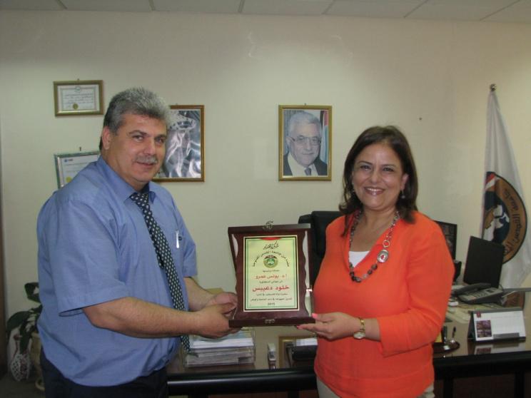 وشكر د. صلاح معالي السفيرة دعيبس على هذه المبادرة الطيبة، وتمنى لها مزيداً من العطاء للوطن، مقدماً لها-باسم رئيس الجامعة أ. د. يونس عمرو-درعاً تقديرية على جهودها وعطائها.