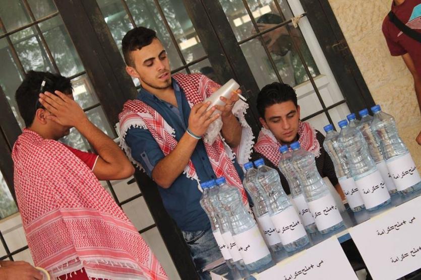 وزعت مجموعة من طلبة القطب الديمقراطي، اليوم الخميس، في جامعة بولتكنيك فلسطين بالخليل، الماء الملح تضامنا مع الأسرى المضربين عن الطعام.
