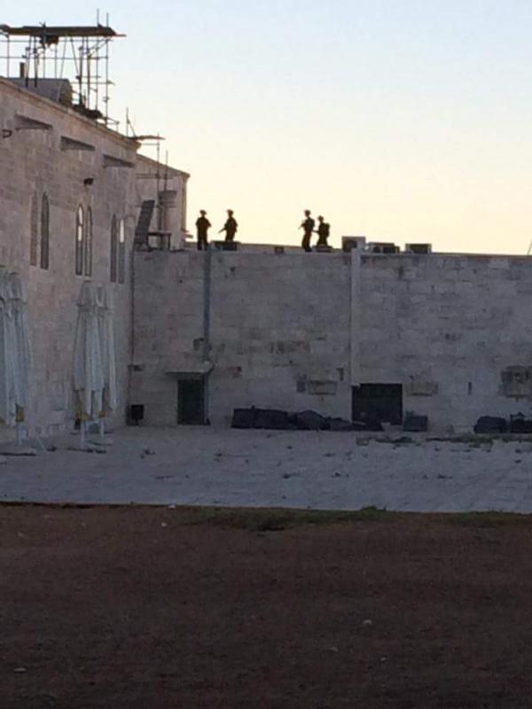 وتواصل قوات الاحتلال حصارها للمعتكفين بداخل المصلى القبلي، حيث تطلق وابل من الرصاص والقنابل، وتسببت باندلاع حريق عند مدخل المصلى القبلي، أخمدته طواقم الإسعاف، في وقت استخدمت لأول مرة مدرعة صغيرة للاحتماء فيها، وفتحت أحد نوافذ المصلى القبلي بحفار صغير 'كونجو'.