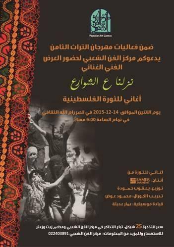 أعلن منسق مهرجان التراث الثامن حازم ابو هلال أنه سيتم عرض مجموعة من الأغاني لفنانين فلسطينيين، تحت عنوان "نزلنا ع الشوراع" واغاني للثورة الفلسطينية.