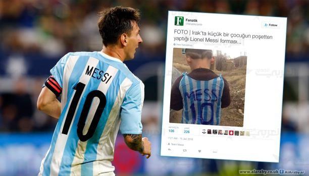 فقد صنع هذا الطفل العراقي قميصاً من كيس بلاستيكي كتب عليه اسم ميسي. ونشرت صحيفة "الموندو ديبورتيفو" الإسبانية عبر موقعها الإلكتروني على شبكة الإنترنت صورة جرى تداولها بشكل كبير على مواقع التواصل الاجتماعي "فيسبوك" و"تويتر".