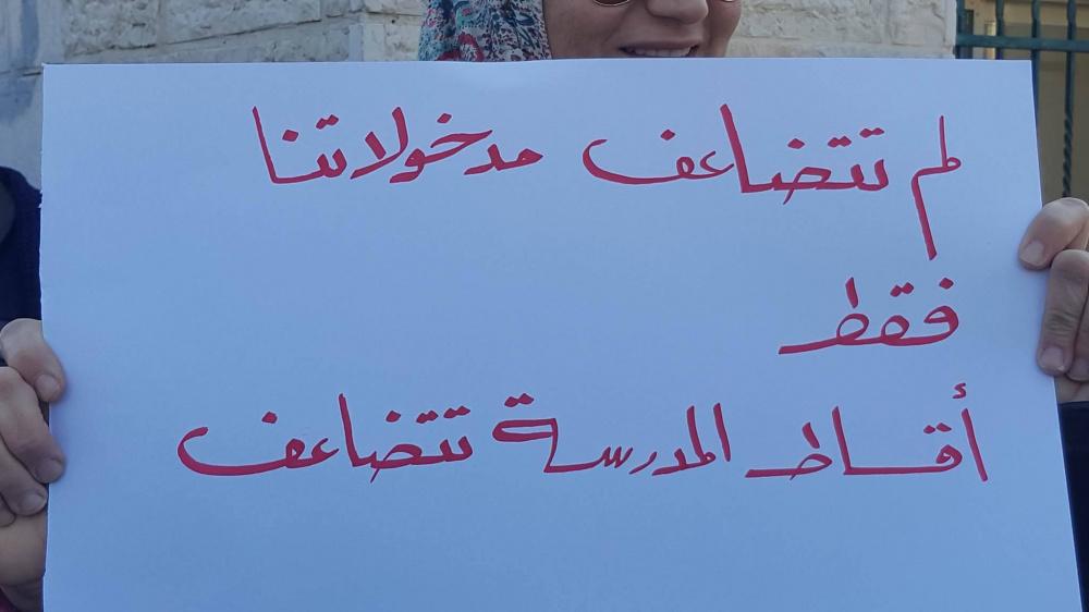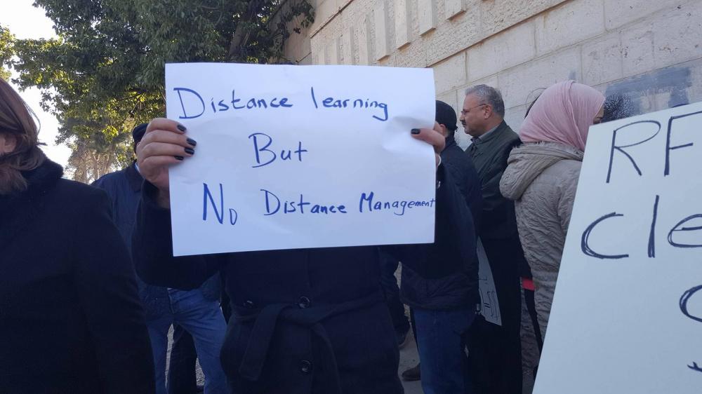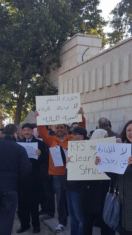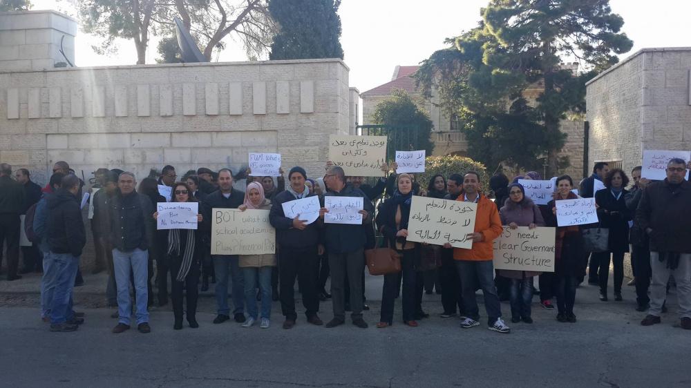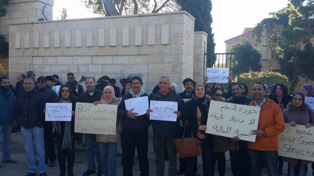 ورفع المعتصمون يافطات تدعو مجلس أمناء المدرسة بوضع خطط أكاديمية وسياسات مالية واضحة، وتطبيق المبادئ والقيم التي تقوم عليها رسالة المدرسة.