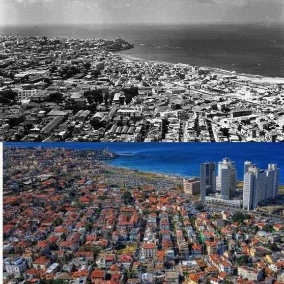 تظهر الصورتان حي المنشية في مدينة يافا ..عام 1944- وعام 2015 والفروقات ما بين يافا قبل قيام اسرائيل على ارض فلسطين عام 1948 وما بين يافا اليوم