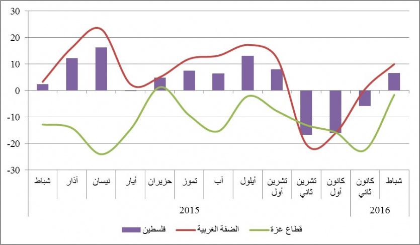 وعلى نفس المنوال، سجّل مؤشر قطاع غزة تحسناً هو الأفضل في ثمانية شهور، إذ قفز المؤشر من نحو -22.5 نقطة في كانون أول إلى -1.6 نقطة في شهر شباط الحالي مدعوماً بتحسّن نشاطي صناعة الغذاء وصناعة الأنسجة والملبوسات بشكل أساسي. فقد شهد مؤشر الأول تحسناً ملحوظاً من -9.3 نقطة إلى 2.1 نقطة، فاق التحسن في مؤشر صناعة الأنسجة والملبوسات الذي ارتفع من -2.3 نقطة إلى حوالي 4.6 نقطة بين كانون ثاني وشباط 2016.