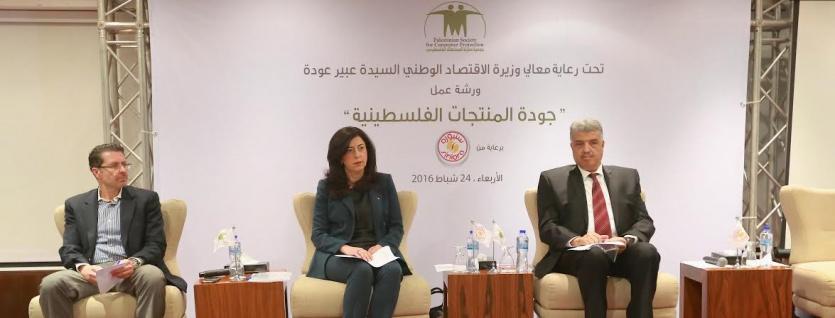 جاء ذلك، خلال ورشة عمل عقدتها جمعية حماية المستهلك، اليوم الأربعاء، الموافق 24 شباط 2016، في مدينة رام الله، حول "جودة المنتجات الفلسطينية"، بحضور وزيرة الإقتصاد الوطني، عبير عودة، ومشاركة مسؤولين وممثلين عن القطاعين العام والخاص.