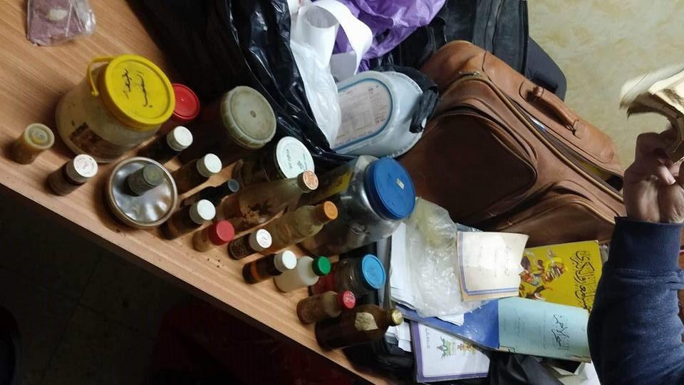 في البيت، كما ترون في الصور، كتب عن السحر والشعوذة والعوالم الخفية وتسخير الجن والشياطين والعالم الاخر. وفي البيت ايضاً، الكثير من المستحضرات والزيوت والعطور، ولبعضها اغراض مخفية.