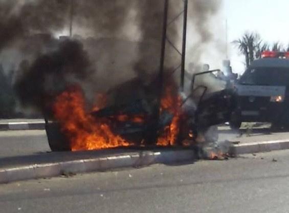 أصيب مواطنان جراء احتراق سيارتهم بعد إصطدامها بعامود كهرباء على طريق صلاح الدين بمنطقة النصيرات وسط قطاع غزة.