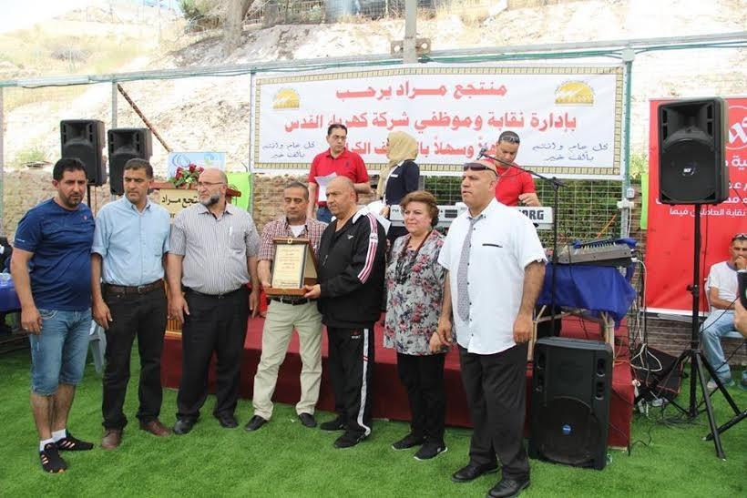نظمت نقابة عمال وموظفي شركة كهرباء محافظة القدس، حفلاً تكريمياً لموظفي الشركة بمناسبة يوم العمال العالمي مدينة بيت لحم، وذلك بحضور م. علي حمودة مساعد المدير العام لشؤون التطوير والتخطيط الاستراتيجي، و م. جواد أبو زر مدير فرع بيت لحم، و م. أكرم شهابي مدير فرع القدس، وم. سلام الزاغة مدير فرع رام الله والبيرة، و م. صبحي الحلاق مدير فرع الشركة في أريحا، وجواد الدبس أمين سر نقابة عمال وموظفي شركة كهرباء محافظة القدس، إضافة إلى عدد من الموظفين والعاملين في الشركة.
