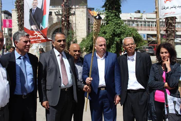 وانطلقت مجموعة من الطلبة من مختلف مديريات المحافظات جرياً على الأقدام بالشعلة، وصولاً بها إلى صالة ماجد أسعد في البيرة، وتم إيقاد الشعلة على مدخل الصالة بحضور أكرم عبداللطيف رئيس مجلس إدارة بنك القدس، والأمين العام مسالمة وكوادر وزارة التربية والتعليم وعلى رأسهم الدكتور بصري.